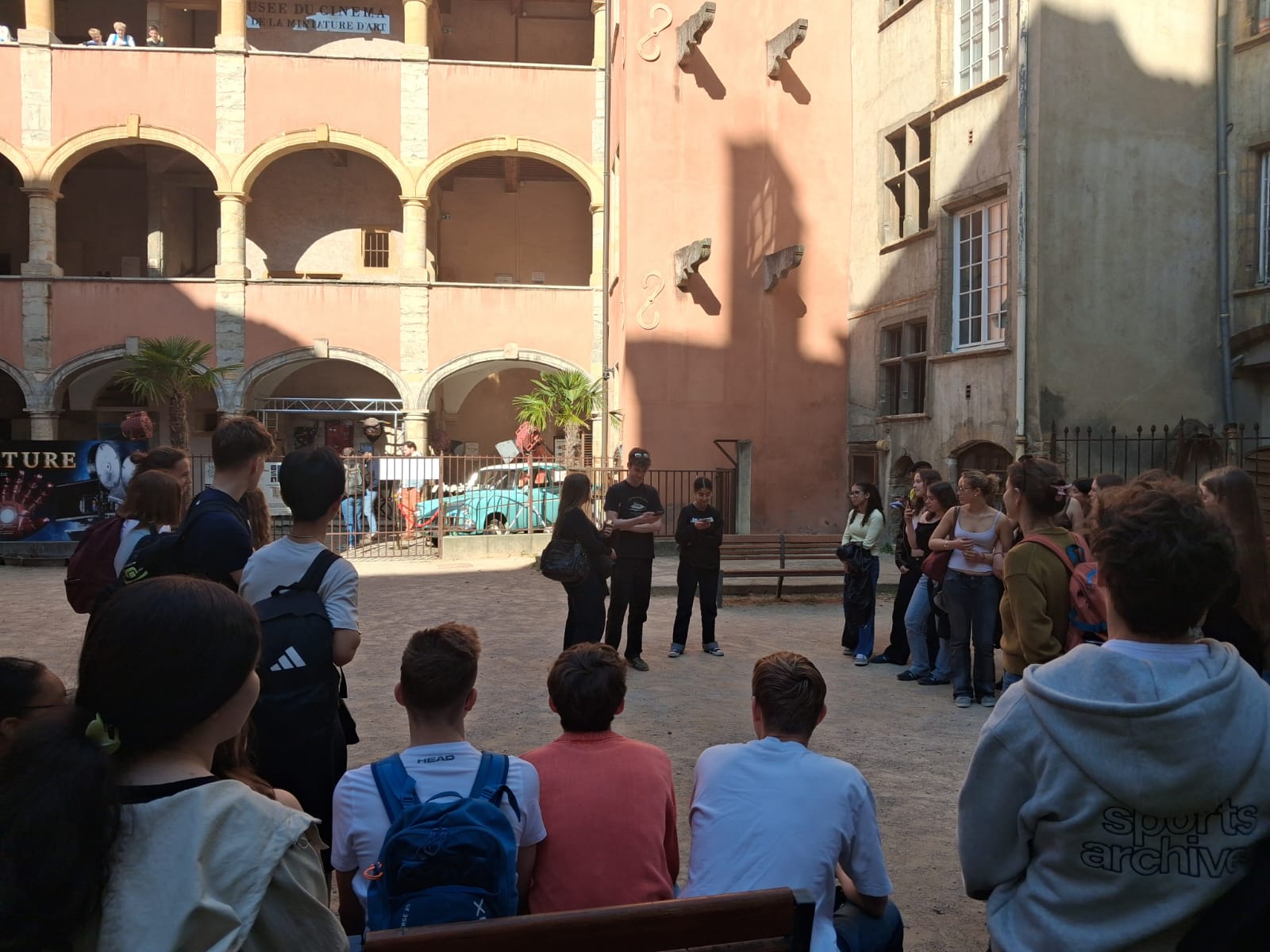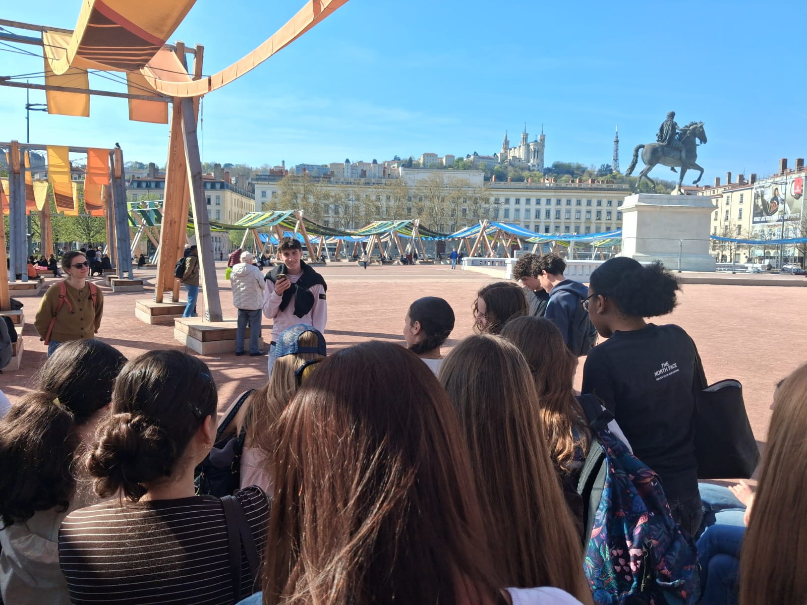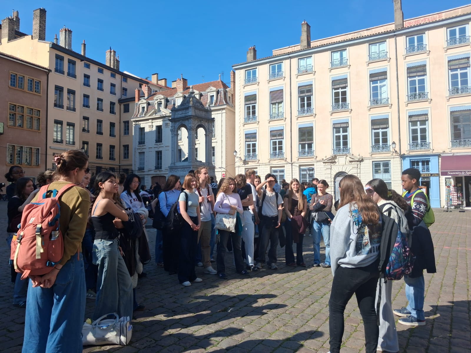 Après une pause déjeuner dans le quartier, nous nous sommes retrouvés en presqu'île pour une visite guidée en allemand préparée par les élèves de la section européenne. Au programme : la place Bellecour, la place Saint-Jean, les traboules et l'architecture Renaissance.